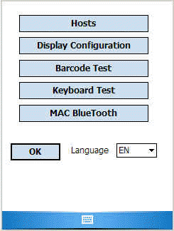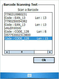 This screen allows you to make a barcode scanning test. The code, the barcode type and length are displayed on the screen. EAN_8 and EAN_13 are two of the available symbologies.